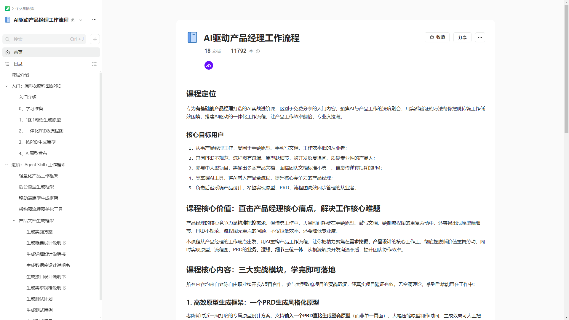 2026 年我想把这些沉淀的经验做成课程,入门内容直接免费分享,进阶课主打 AI 驱动的产品工作一体化,核心教你驾驭 AI 的核心技巧,让原型、PRD、流程图做到业务、逻辑、细节完全一致,从根源解决传统产品工作的三大痛点:原型图、流程图、PRD。